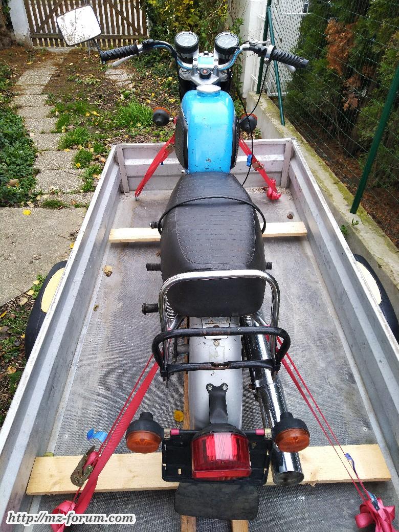 Die TS 125 direkt nach dem Kauf, noch auf dem Anhänger verzurrt