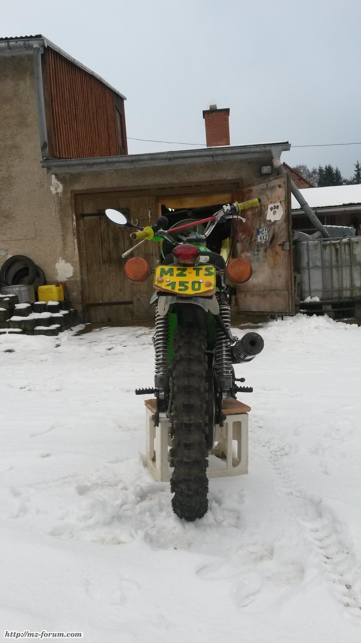 hier meine 150er nach einigen umbauten vorn mit 21zoll und hinten 18 zoll kann hinten auch 16 zoll ohne größeren aufwand fahren.Fahre auch rennen (motorradbiatlon)hin und wieder.letztes fuhr ich am 17.9.2016 in Billberge in der Classic-Klasse mit was super spaß machte.Früher fuhr ich im Club MSC STRAßBERG mit einer MZ ETZ 150 Rennen,mußte das Fahren aus beruflichen Gründen hinten anstellen.