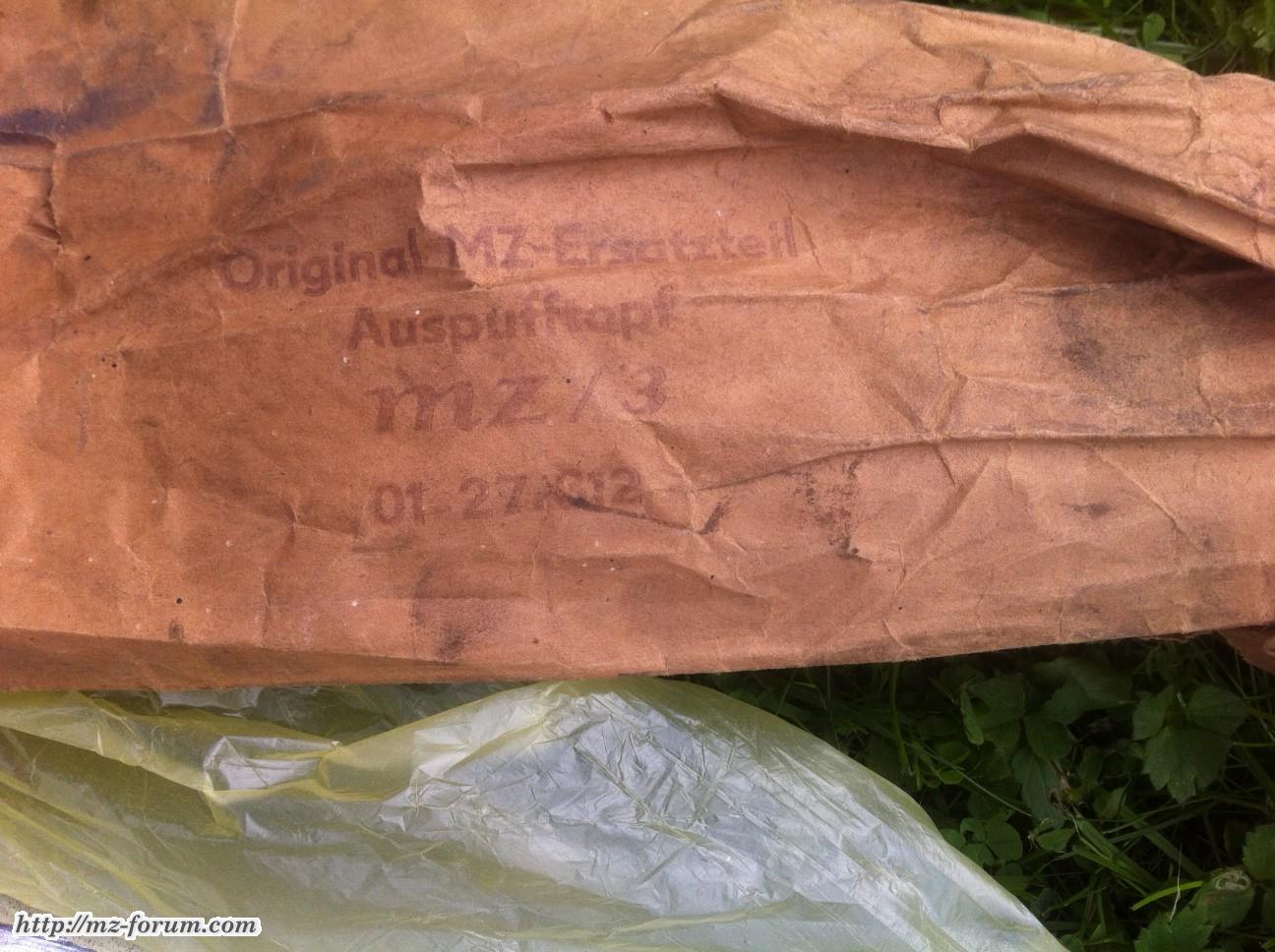 Könnte ein Ersatzauspuff für die RT sein, aus der Zeit als die Zigarre nicht mehr gefertigt wurde. Dafür sprächen auch das /3 auf der Tüte und die mit 01- beginnende Ersatzteilnummer...
