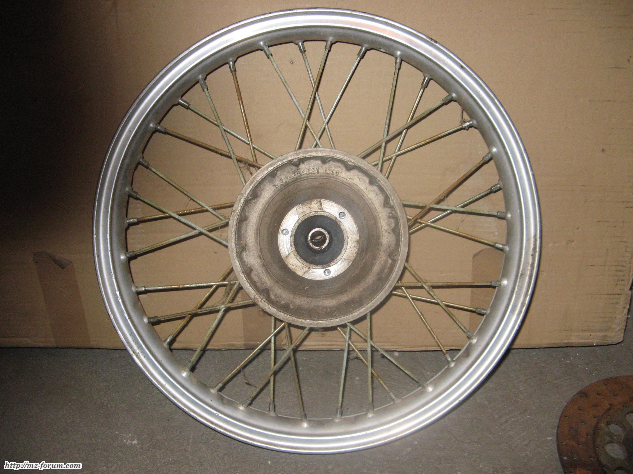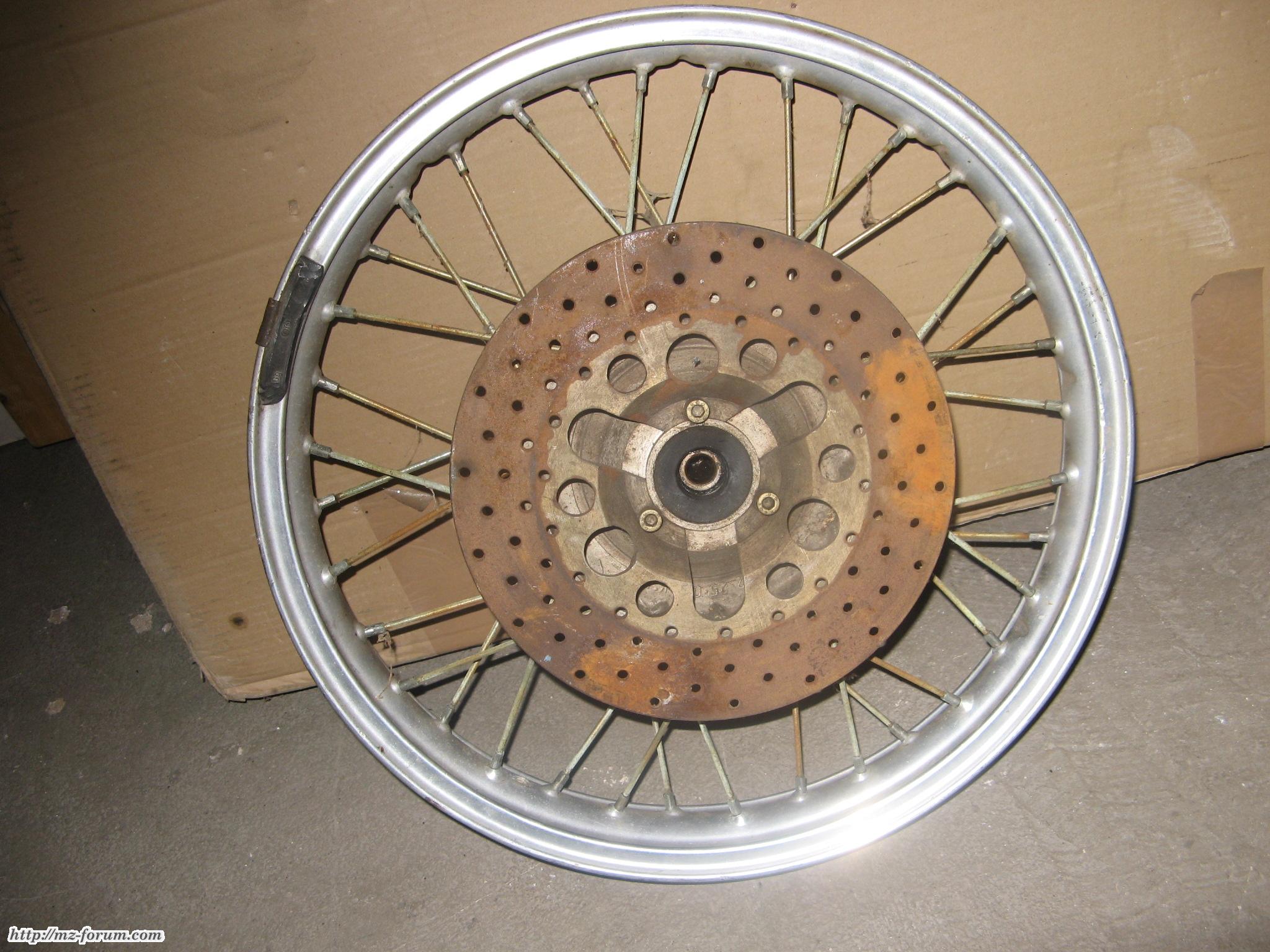 Ich hatte eine MZ-Achse mit auf dem Teilemarkt, so zum rumprobieren. Die passte schonmal rein. Die Nabe erinnerte mich schwach an eine MZ-Scheibenbremsnabe, vielleicht n bisschen umoperiert? Auf jeden Fall gerade Speichen, das sah gut aus - nach 8 Stunden Teilemarkt ist der Geist vielleicht schon etwas trübe. Gut, ich hab das komplette Zeug gekauft. Der Verkäufer gab mir zum Schluss die Worte mit auf den Weg:
