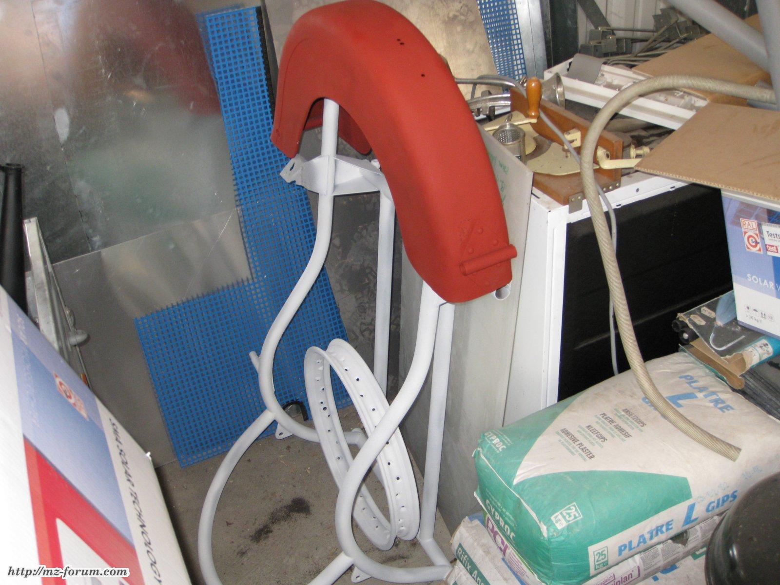 Es könnte noch ein Problem geben: in dem Koti hab ich Schleifspuren vom Rad gefunden - d.h. die Schwinge könnte verzogen sein. Das hatte der Falke, den ich besichtigt hatte auch gehabt. Der hatte sich so geholfen, daß er die Aufnahme des Kotis geändert hat. Wenn ich den ganzen Kram wieder da habe muß ich das mal zussammenstecken und genau begutachten